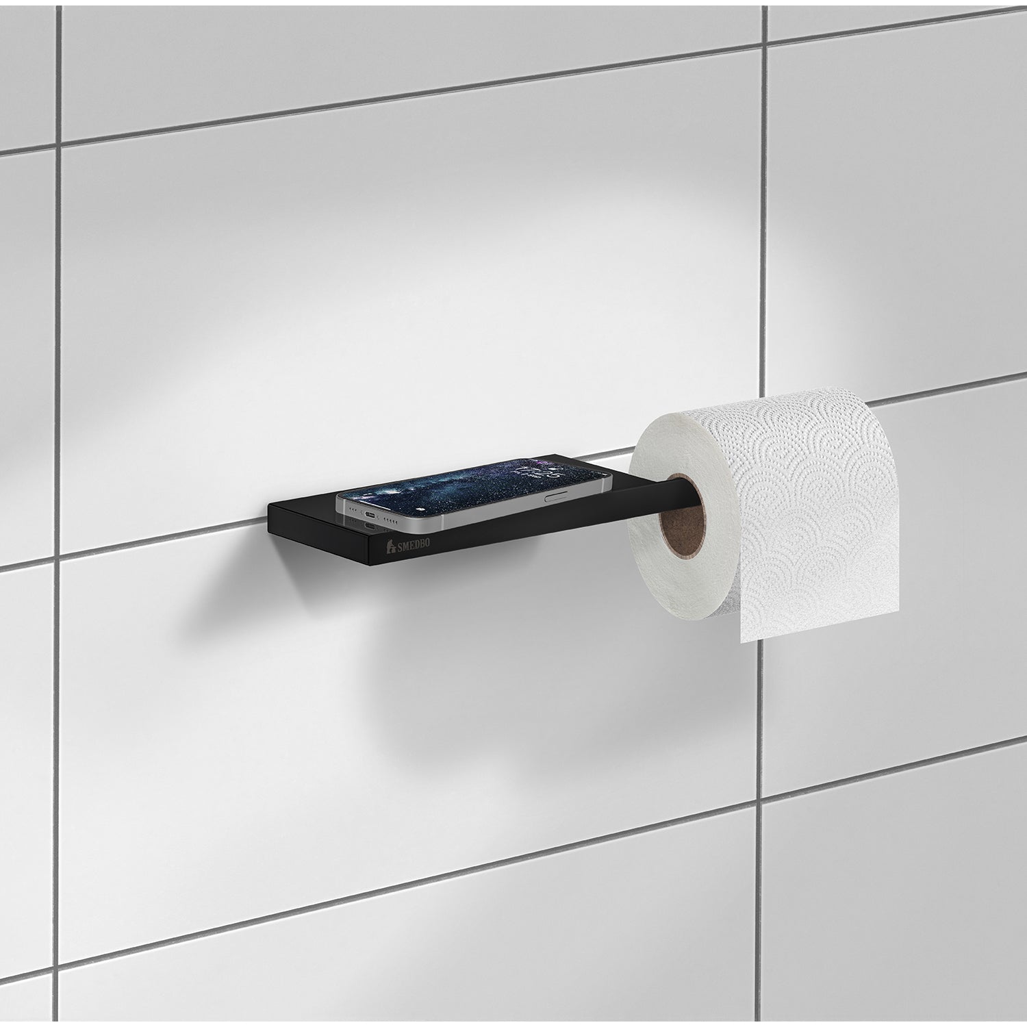 New in our range is our unique toilet paper holder with shelf. It takes inspiration from the fact that more and more people bring their mobile phones into the bathroom, and thus we saw a need. The shelf is a practical place to store small bathroom items or decorative details.