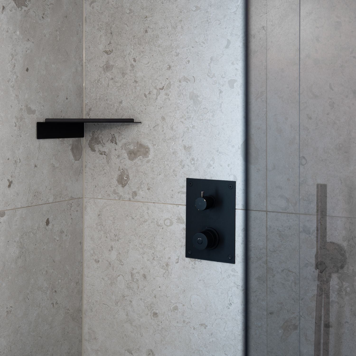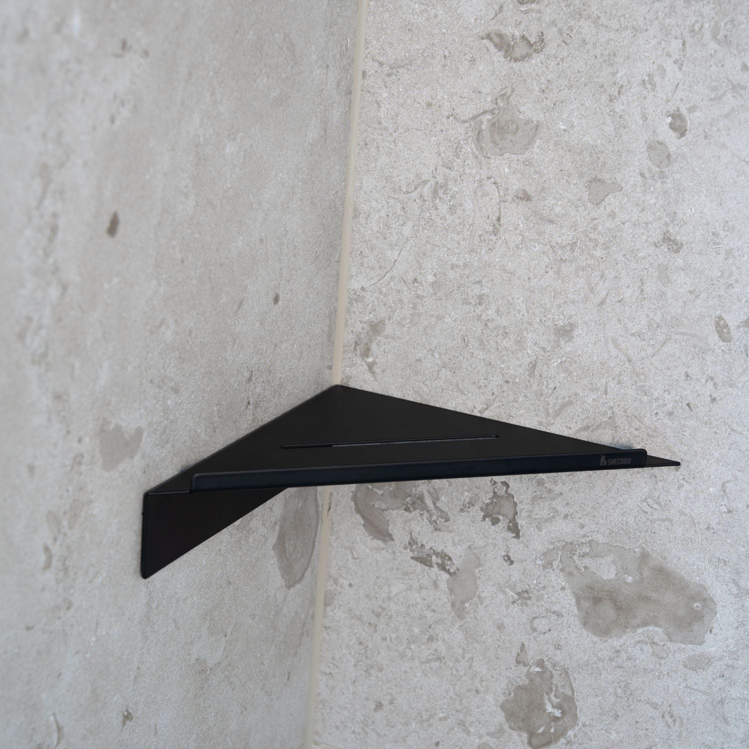 SIDELINE Corner Shower Shelf. Self-adhesive. Black stainless steel. 210 x 210 mm. Wallplate Height 47 mm.